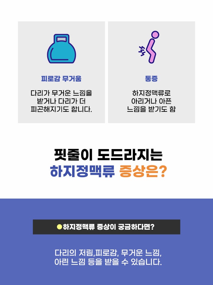 하지정맥류 문제가 생기면서 다리에 구불구불 튀어나오는 정맥이 스트레스가 될 수 있습니다. 핏줄이 늘어나면서 다리가 무거운 느낌을 받기도 하고, 다리가 더 쉽게 피로해지는 느낌을 받기도 합니다. 단순히 피로감을 느끼는 것 말고도 다리가 아리고 저린 느낌, 아픈 느낌이 생겨서 불편함을 느끼는 분도 있다고 합니다.