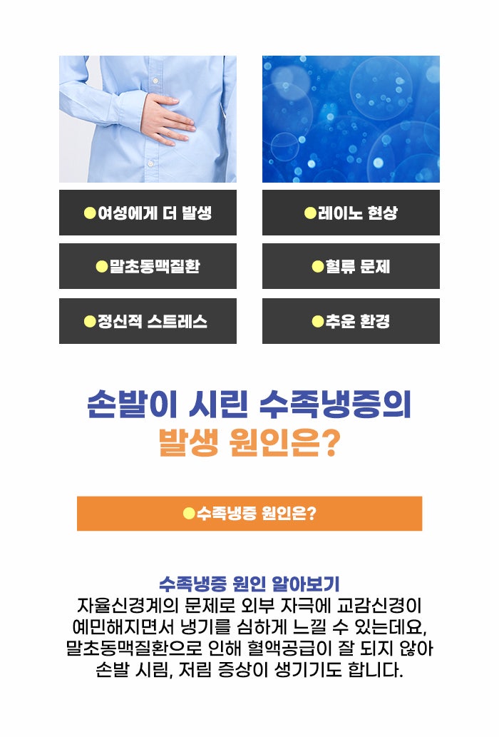 이런 이유로 손발이 시리고, 찬 증상이 나타나기도 하는데요. 심한 경우 저림 증상, 레이노 증후군에 대한 고민이 생길 수도 있다고 합니다. 수족냉증이 발생하는 명확한 원인을 파악하기 어려울 수 있다고 하는데요. 특히 여성에게 많고 호르몬 변화, 임신 출산, 폐경 등과 연관성이 있을 수도 있다고 합니다. 걱정스러운 증상이 있을 경우 내 건강과 일상을 지키기 위해 힘쓰셨으면 좋겠습니다.