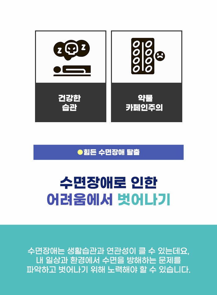 환경 문제나 일상생활 패턴 문제 등으로 적응성 불면증이 생기는 경우도 있으며, 수면장애를 일으키는 흔한 약물인 카페인 성분 음료 복용, 다양한 약물 문제 등으로 인해 약물이나 알코올 의존성 수면장애가 생기기도 합니다. 다리에 벌레가 기어가는 것 같은 이상 감각이 느껴지는 하지 불안 증후군 역시 수면장애를 불러오는 중요한 이유가 되기도 하며, 내과적 질환, 정신 질환 등으로 인해 수면 문제를 겪기도 합니다.