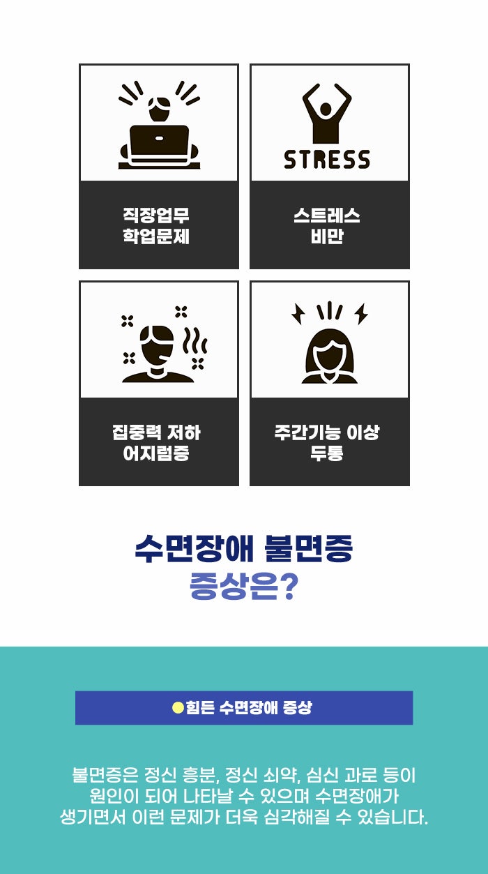 수면은 사람의 몸과 마음을 회복하는 중요한 시간입니다. 그렇다 보니 수면이 부족해질 경우 주간 기능 저하, 졸리고 집중력이 떨어지는 현상 등이 나타나기도 하는데요, 심한 경우 직장 업무에서 어려움을 겪고 학업에도 지장이 생기기도 합니다. 반복되는 불면증은 성인에게 주로 나타나지만 어린이, 청소년도 다양한 이유로 수면 장애를 겪을 수도 있다고 합니다.