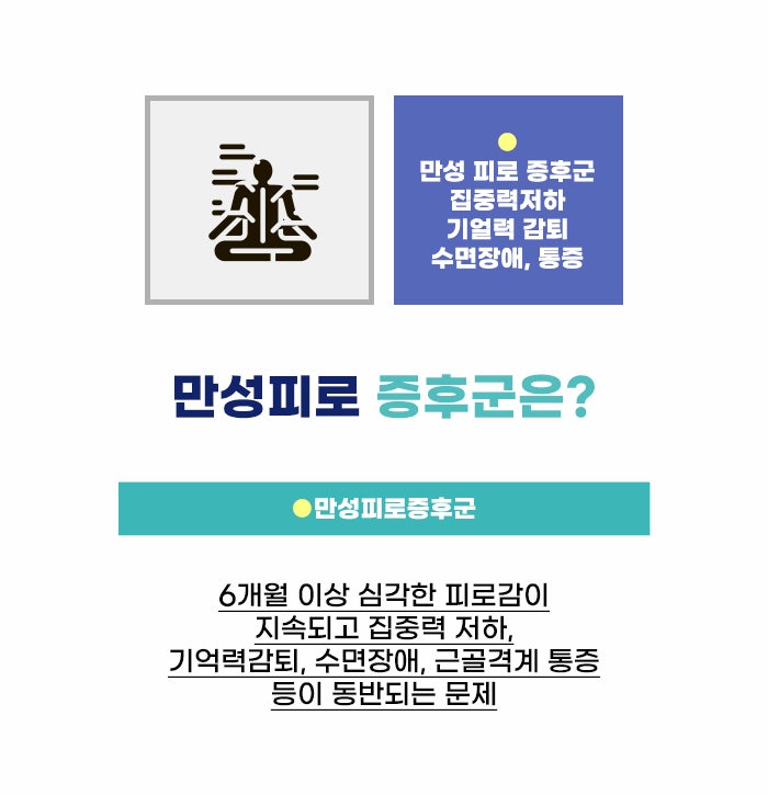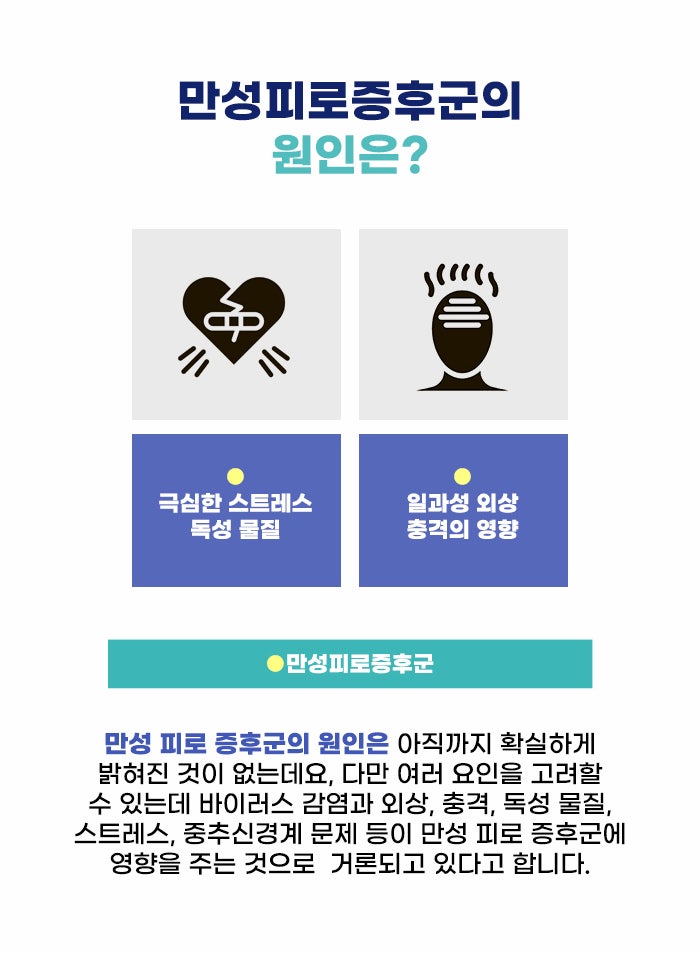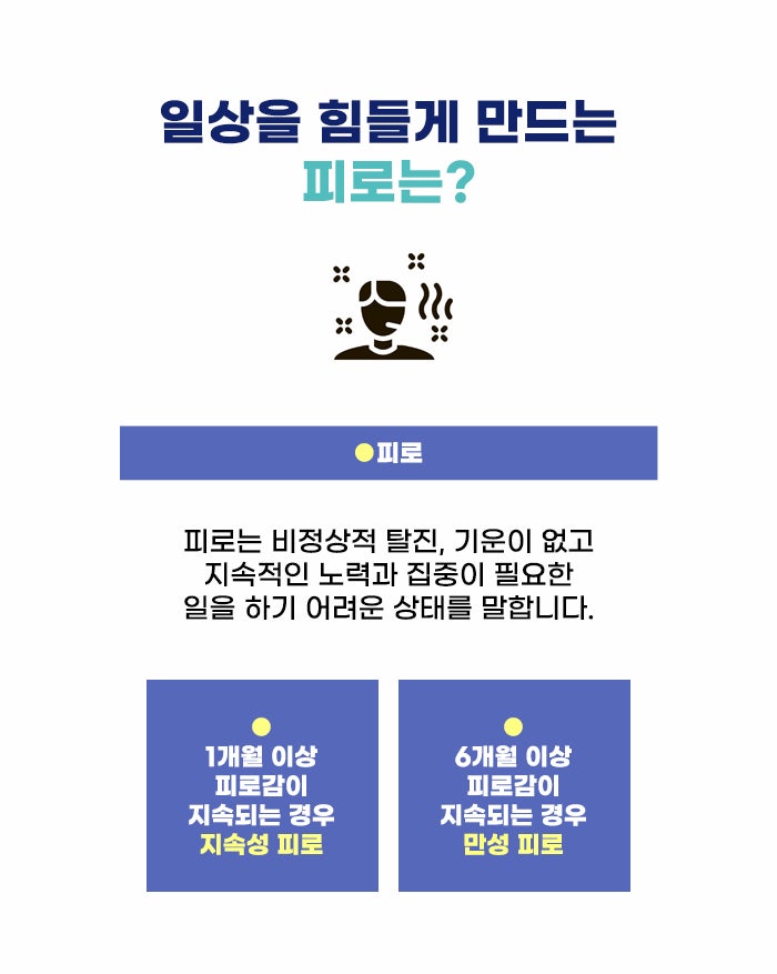 1달 정도 피로감이 사라지지 않는다면 지속적 피로라고 하는데요, 심한 피로가 6개월 이상 이어지고 이로 인해 평소 기능의 저하가 동반된다면 만성피로 증후군으로 볼 수도 있다고 합니다. 일반적인 활동을 하고 있고 특별한 이유가 없는 것 같은 상황에서도 심한 피로에 시달리는 만성 피로 증후군은 명확한 원인이 밝혀지지 않은 만큼 대처가 더욱 어려울 수도 있는데요, 되도록 충분한 휴식 시간을 갖고 내 마음과 몸을 돌보는 시간을 가지셨으면 합니다!