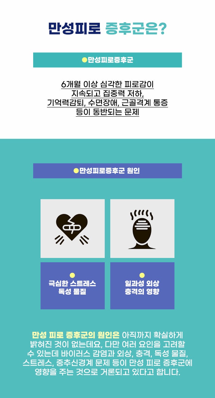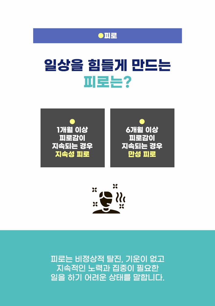 누구나 힘든 일을 하고 난 후에 지치고 피곤함을 느낄 수 있습니다. 그런데 일상생활을 다른 사람과 비슷하게 하면서도 지나치게 지치고 다른 일을 생각하거나 노력하기 어려울 정도로 피로감을 느낀다면 문제가 될 수도 있는데요. 1개월 이상 피로가 이어지는 경우 지속성 피로라고도 합니다. 그리고 6개월 이상 심한 피로와 기능 저하를 경험하고 있다면 만성 피로 증후군을 고려할 수도 있다고 하니 참고하셨으면 합니다.