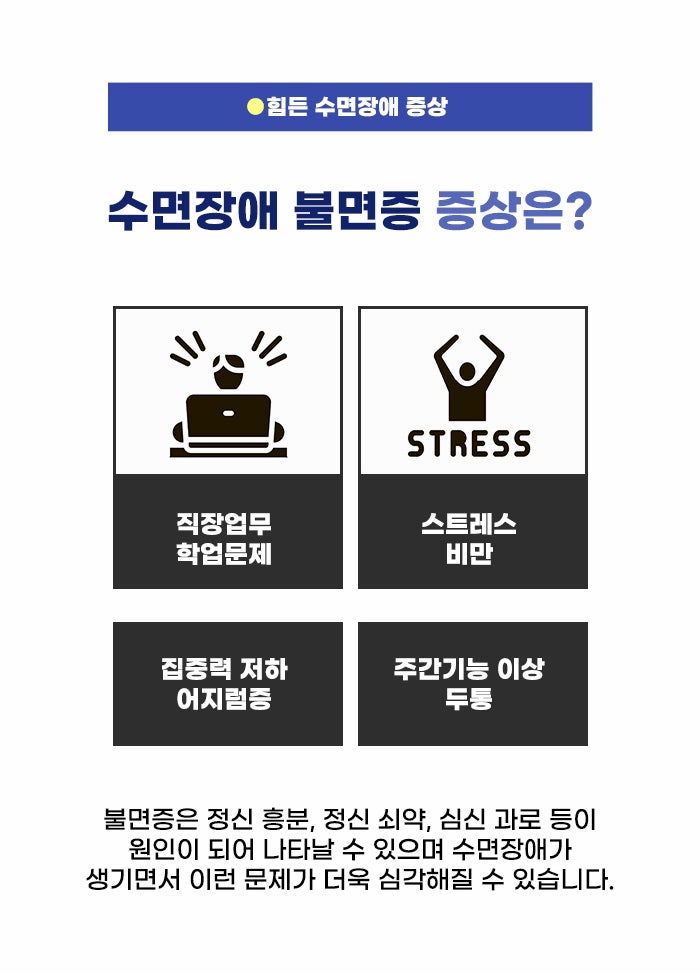 이렇게 잠에 들지 못하는 시간이 많아지고 수면의 질이 떨어지면서 여러 문제가 생길 수 있습니다. 우선 주간 기능의 저하가 생기기에 학업이나 업무에서 지장이 생기게 될 수 있습니다. 중요한 시험을 준비하거나 예민한 일을 처리하다 실패할 가능성이 커지기도 합니다. 그리고 스트레스, 비만 문제, 당뇨나 고지혈증, 고혈압 등의 질병 위험이 커질 수도 있다고 합니다.