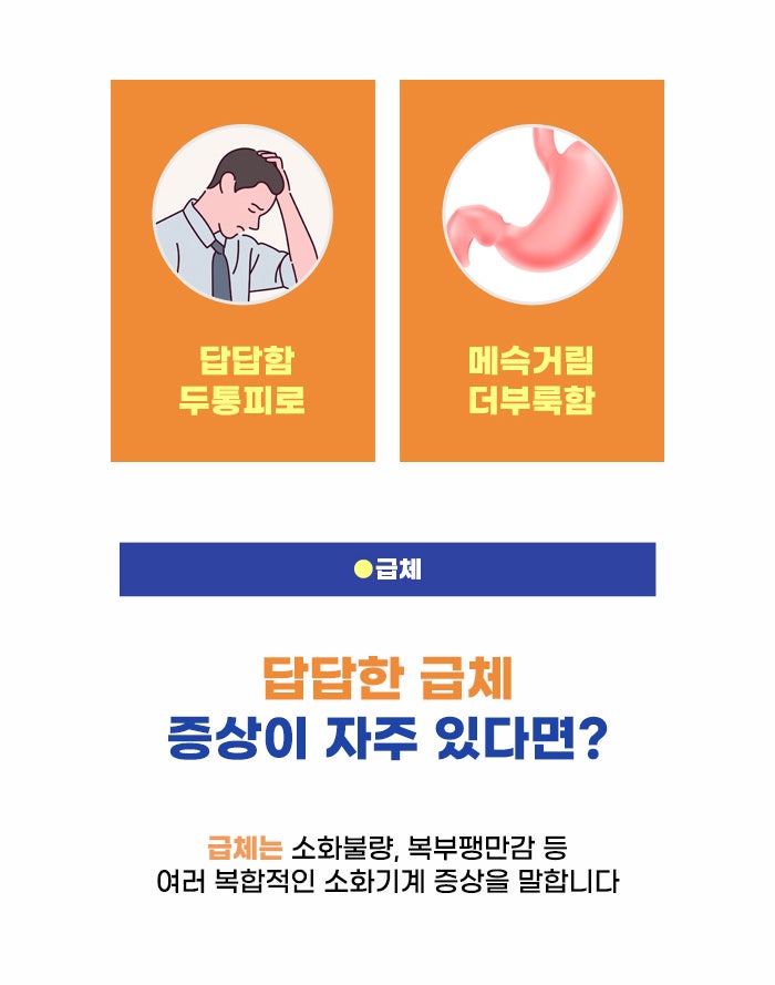 급체는 식사 후 더부룩함, 메슥거림, 복통 등의 증상이 나타나기도 하고, 두통과 심한 피로감, 심하면 구토까지 하는 증상인데요, 식사 후 제대로 소화가 진행되지 않고 위 안에서 정체된 시간이 길어지며 이런 증상이 나타나는 경우도 있다고 합니다. 음식을 먹은 후 급체 증상이 빈번하다면 더 이상 음식을 먹는 자리가 즐겁지 않고 큰 고민이 될 수도 있습니다.