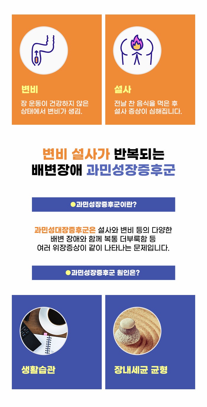 답답한 복통, 변비 증상이 이어질 경우 기력 저하, 일상의 질 저하를 겪을 수 있는데요, 변비 증상만이 아니라 식사 후 배가 아프고 설사를 하는 증상, 복부팽만과 잦은방귀 증상으로 불편함을 겪는 경우도 있습니다. 이런 배변 장애가 만성적으로 이어지는데 특별한 이유를 찾기 어려울 경우 과민성장증후군을 의심할 수도 있다고 합니다. 소화 과정과 배변 과정에서 발생하는 여러 문제가 삶의 질을 낮출 수 있는데요, 불편한 증상이 걱정된다면 방치하지 말고 빠르게 문제를 파악할 수 있었으면 합니다.