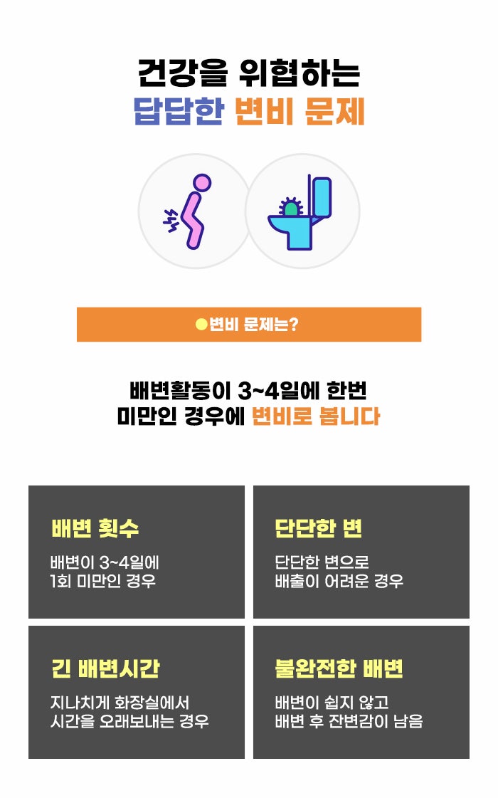 그런데 정상적인 소화 과정이 이루어지지 못하고 마지막 배출 단계에서 정체되어 복통, 복부팽만 등의 증상을 겪기도 하는데요, 2~3일에 1회 이하로 배변을 하는 경우, 배출이 어렵고 시간이 너무 오래 걸리는 경우, 그리고 잔변감, 불완전한 배변으로 인한 증상에 시달리는 경우를 두고 변비로 본다고 합니다.