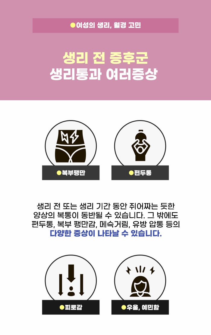 통증이나 불편한 증상이 생리 기간에만 생기는 게 아니라 생리가 시작되기 전에 생기면서 운정 생리통 한의원 정보와 생리통 관련 정보를 알아보고 고민하는 경우도 있다고 하는데요. 생리 전 불쾌함, 우울감, 짜증, 예민함, 그리고 피로감, 소화기 문제와 식욕 변화 등을 겪는 것을 두고 생리 전 증후군이라고 부르기도 합니다.