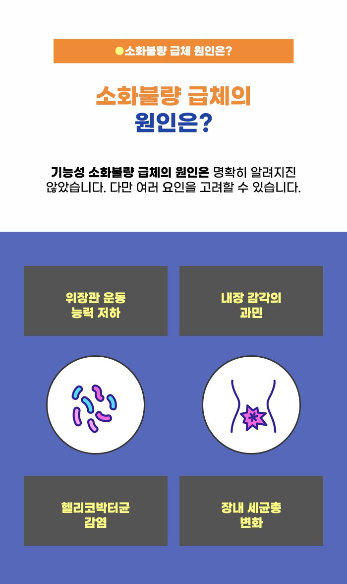 소화불량의 원인은 어떤 게 있을까요? 소화가 어려워지는 데는 여러 요인이 있다고 하는데요. 약물의 영향에 의해 소화가 어려운 경우도 있으며, 헬리코박터균의 감염 등, 세균, 진균 감염 등으로 인해 소화가 어렵고 복통 증상이 나타나는 경우도 있을 수 있다고 합니다. 또한 위장관 운동 능력 저하 혹은 이상, 내장 감각의 과민 등도 소화가 어려워지는 이유가 되기도 합니다.
