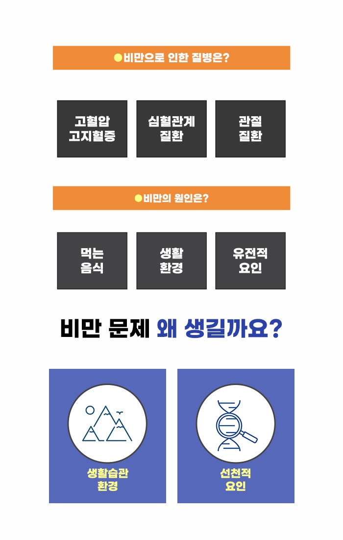 체내에 지방조직이 지나치게 축적된 상태라는 정의가 있다고 하는데요. 선천적 요인이나 생활 습관 등이 영향을 미치면서 비만이 될 수 있다고 합니다. 몸에 들어온 음식은 분해되며 사용되는데, 사용하지 못하고 남은 잉여 에너지가 지방의 형태로 몸에 저장된다고 하는데요. 그렇기에 과체중을 넘어서서 비만이 되었다는 것은 오랜 시간에 걸쳐 먹는 음식과 사용되는 에너지의 불균형이 이루어진 상태라고 생각됩니다.