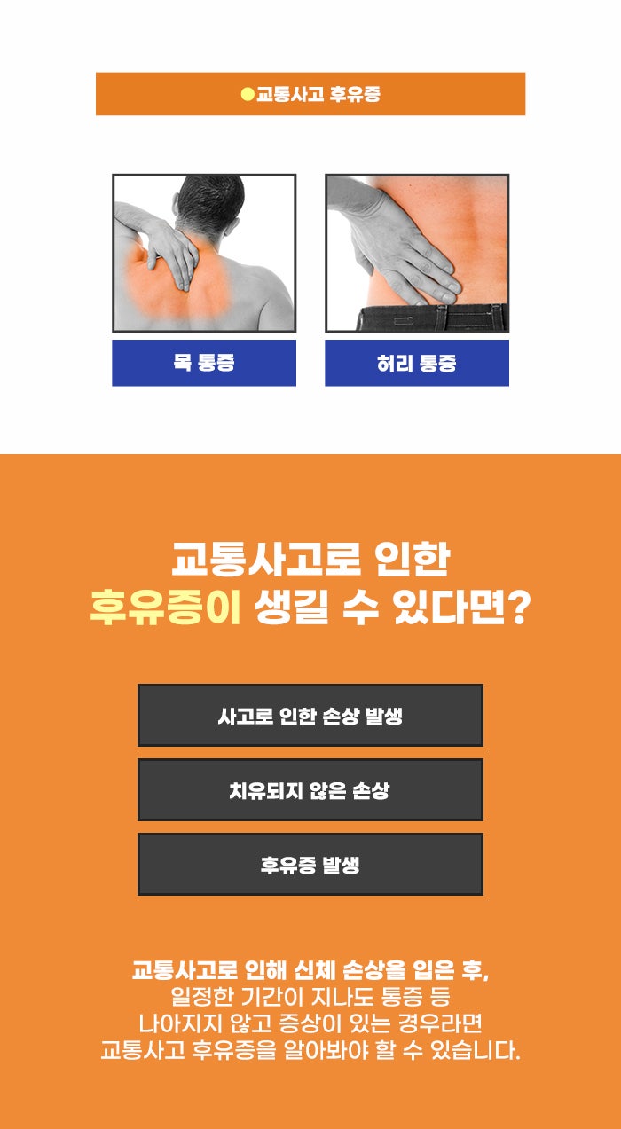 그렇다 보니 처음에는 작은 통증, 무시할 만한 작은 증상으로 시작해 점점 더 의식할 수 있을 정도로 증상이 뚜렷해지고 통증이 커지는 경우가 있다고 합니다. 그런데 이런 경고 없이 갑자기 내 몸에 건강 이상이 생길 수도 있는데요. 바로 사고, 외부의 충격 문제 등을 겪으면서입니다. 특히 교통사고는 현대인의 건강과 생명을 위협하는 문제로, 사고 직후에는 이상이 없는 것 같아도 통증이 시간이 지나면서 더 심해지고 오랜 시간 남을 수도 있다고 합니다.