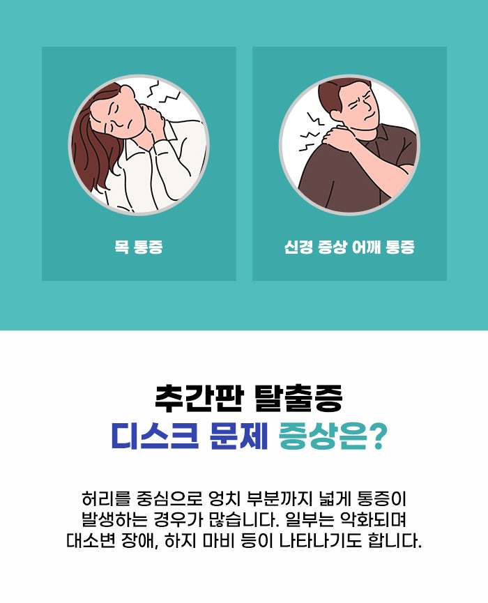 특히 허리 부분이나 목 부분에 주로 생기는 게 디스크 문제인데요. 휼추, 천추 등 다른 부분에 일반적으로 생기지 않는 것은, 허리와 목이 사람의 몸 중에서 운동성이 큰 부분이기 때문일 것이라고 생각됩니다. 추간판이 튀어나올 경우 신경에 자극을 줄 수도 있는데요. 이런 이유로 인해 허리 부분에만 통증이 생기는 게 아니라 신경이 이어지는 다른 부분에도 통증이 느껴질 수도 있다고 합니다.
