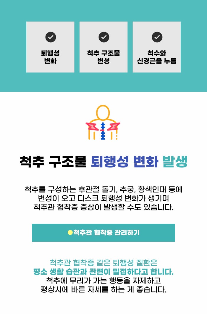 척추 구조물의 퇴행성 변화가 진행되고 척추관을 구성하는 추궁, 황색인대, 후관절 돌기 등에 변성이 오고 두꺼워지면서 척추관이 좁아지는 게 척추관 협착증의 중요 원인일 수도 있다고 합니다. 신체의 퇴행성 변화는 원한다고 해서 쉽게 막을 수 있는 것은 아닌데요. 하지만 나쁜 자세, 무리한 활동도 척추관 문제에 영향을 줄 수 있기에 바꿀 수 있는 자세부터 관심을 가지고 좋은 자세를 유지하기 위해 노력하는 게 필요할 수 있겠습니다.