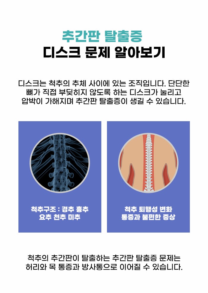 먼저 언급했듯이 컴퓨터를 오래 하고 모니터를 오래 바라보는 분의 경우 거북목 자세가 되기 쉽다고 합니다. 거북목으로 인해 척추 부담이 커지면서 생길 수 있는 위협인 추간판 탈출증은 무엇일까요? 척추의 추체 사이에 있는 추간판이 밀려 나오고 염증, 통증이 생기는 척추 질환이 추간판 탈출증이라고 합니다. 발생 부위는 척추 중 경추, 요추 부분에 주로 생긴다고 합니다.