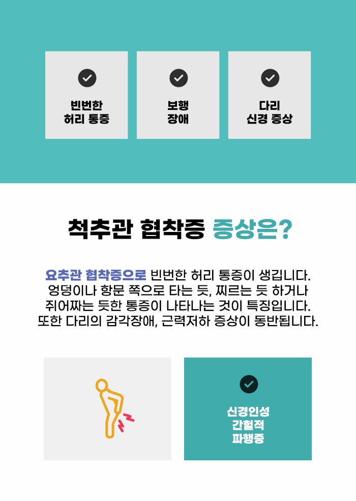 타원형 혹은 삼각형인 척추관은 목에서 가장 넓으며 가슴 부분에서 좁아졌다가 허리 부분에서 다시 커진 뒤, 하부로 갈수록 좁아지는 형태라고 합니다. 이 척추관이 어떤 이유로 좁아질 경우 신경에도 압박이 커지게 되는데요. 주로 허리 부분에 이런 문제가 생기는 경우가 흔하다고 합니다.