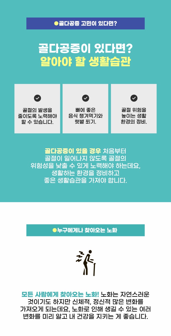 특히 고령인 경우 골절 회복도 쉽지 않고 근육량도 적은데요. 외부와의 긍정적 자극과 소통이 줄어들면서 사회적 어려움, 정신적 어려움을 겪고 지칠 수도 있다고 합니다. 골절로 인해 생길 수 있는 어려움이 큰 만큼, 골절 예방을 위해 평소 노력하는 게 좋습니다. 또한 골절이 쉬운 상태가 되는 게 골다공증인데요. 골다공증에도 관심을 가졌으면 합니다.