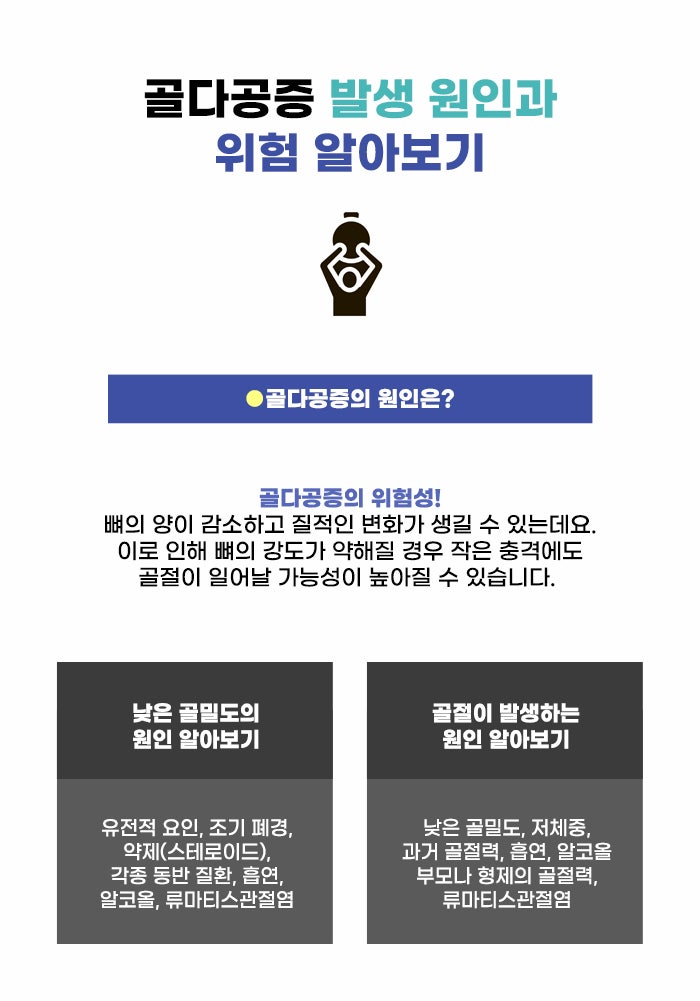 골다공증은 골밀도가 낮아지고 뼈의 질이 낮아지면서, 골절이 쉬운 상태가 되는 것입니다. 일반적으로 골다공증은 크게 자각할 만한 증상이 없습니다. 그렇기에 이미 골절이 생긴 후에 골다공증이라는 것을 알게 되기도 합니다. 골다공증은 중년 갱년기 이후 여성, 고령층에게 위험도가 높다고 하는데요. 그렇기에 나이를 먹으며 골다공증과 골절 위험에 대해서 알고 대비하셨으면 좋겠습니다.