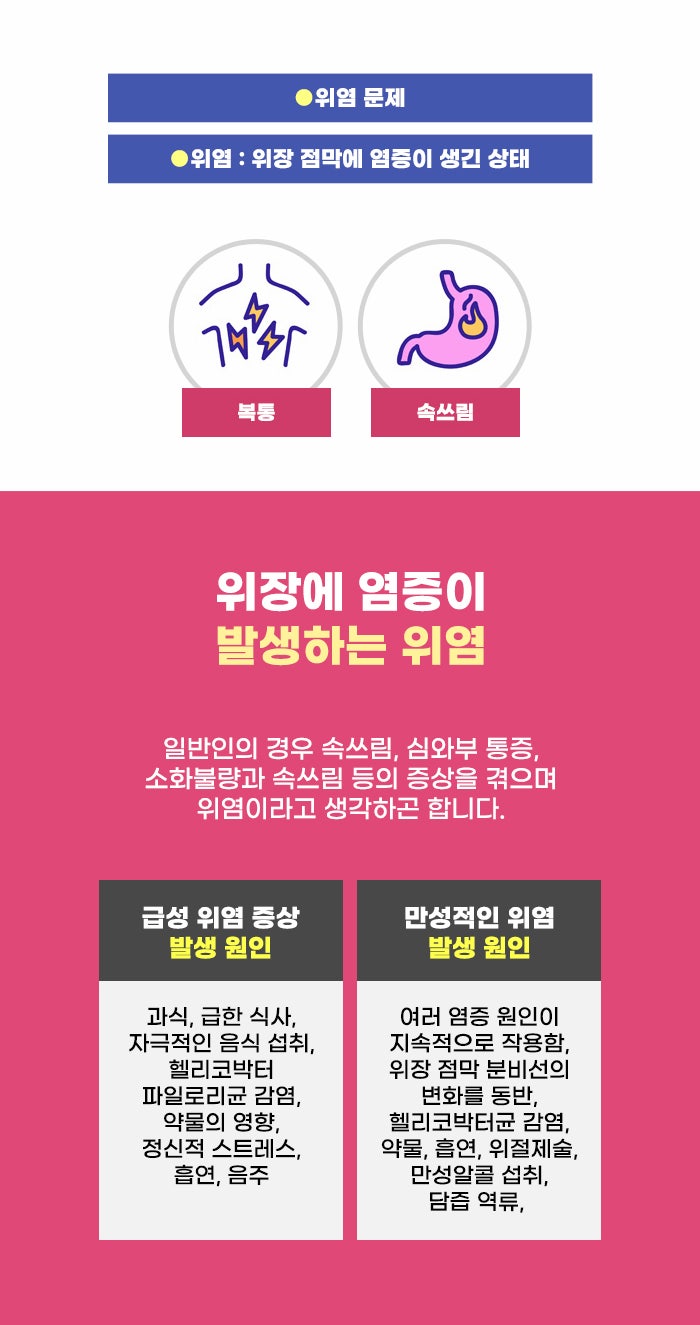 특히 위염 문제는 오래 이어지면서 위암의 발생 확률이 올라갈 수 있는데요. 위의 표면 점막이 얇아지는 위축성 위염 상태가 될 수도 있다고 하는데요. 현재 잦은 목 통증, 가슴 부위의 쓰림, 복통, 소화불량으로 고생하고 있다면 위 건강을 챙길 수 있다면 좋겠습니다.
