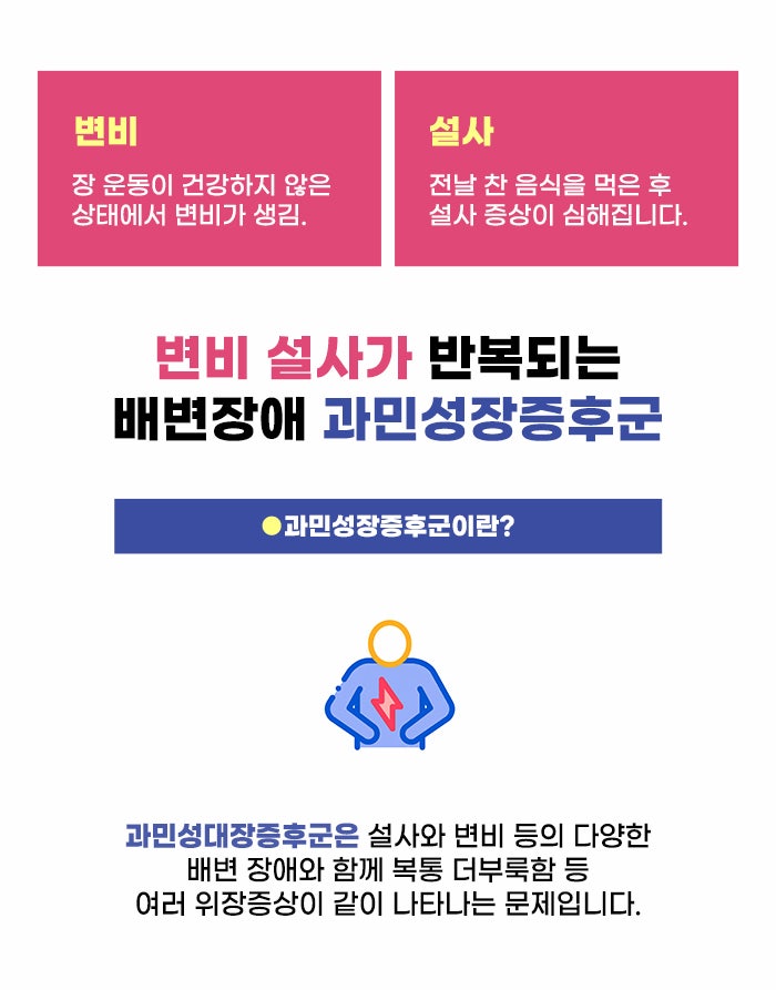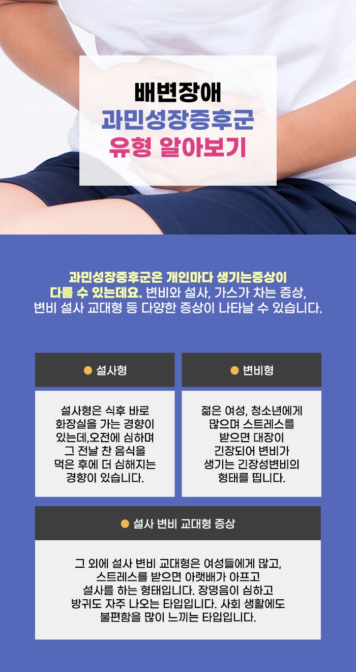 그리고 뱃속이 불편하고 설사를 하는 경우에도 가스가 차고 배가 부글거리는 느낌을 받으며 복부팽만감 증상을 걱정하기도 하는데요. 이런 경우 배변 후에 증상이 완화되는 편입니다. 맞지 않는 음식 섭취, 과식, 음주 등의 이유로 누구나 이런 변비, 설사 증상을 겪을 수 있습니다. 그런데 특별한 원인, 장의 염증 문제가 없지만, 설사, 변비를 자주 겪는 분도 있는데요. 이런 상황이라면 과민성장증후군이 궁금할 수 있습니다.