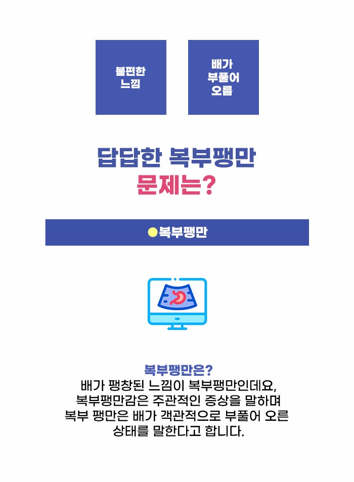 배가 팽창된 느낌을 통틀어서 복부팽만감이라고 합니다. 배가 부풀어 오르는 것 같고 가스가 차고 불편한 느낌을 받을 수 있는데요. 실제로 복부 둘레가 늘어나지 않은 경우 복부팽만감이라고 하며, 실제로 배가 나온 경우 객관적으로 알 수 있는 복부팽만이라고 할 수 있습니다. 다양한 원인으로 복위가 증가할 수 있는데요.