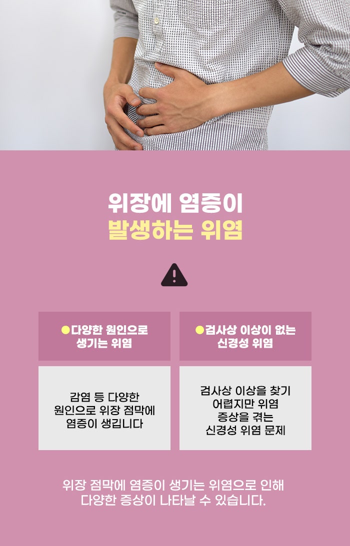 위점막에 염증이 생긴 상태가 위염이며, 염증이나 이상이 없지만 소화불량, 복통, 더부룩함, 속쓰림 등이 생길 경우 신경성 위염에 대해서 살펴봐야 할 수도 있습니다. 특히 스트레스 문제는 신경성 위염, 그리고 실제로 염증이 발생한 위염 상태의 원인이 될 수도 있다고 합니다. 그 밖의 위염 원인을 알아보자면 헬리코박터 파일로리균 감염이 있습니다.