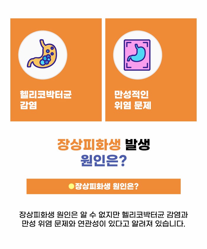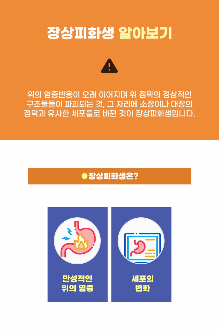 위의 위산, 펩신 등의 공격 요소, 위점액 등의 방어 요소 균형이 깨지면서 위염이 생기기 쉽습니다. 위 안에 염증반응이 있고, 이 염증이 오래 이어지면서 위 점막의 정상적인 구조물에 변화가 생길 수 있습니다. 구조물이 파괴되고 소장, 대장 점막과 유사한 세포로 바뀔 수 있는데요. 이런 상태가 된 것을 두고 '장상피화생'이라고 부릅니다.