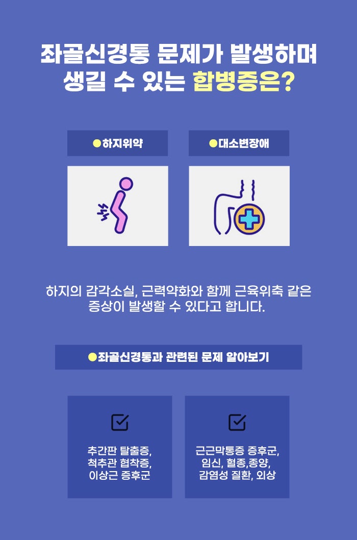 종양, 좌골신경이 지나가게 되는 구조물 등에 의해 좌골신경이 눌리며 증상이 생기기도 하고, 좌골신경 자체의 손상과 염증에 의해 통증이 생길 수도 있다고 합니다. 시간이 지나면서 하지 감각 소실, 근력 약화, 근육 위축 등의 여러 문제가 생기기도 하는데요. 현재 골반 부위 통증이 고민되고 좌골신경통도 고민이 된다면 꼼꼼히 문제를 파악할 수 있었으면 합니다!