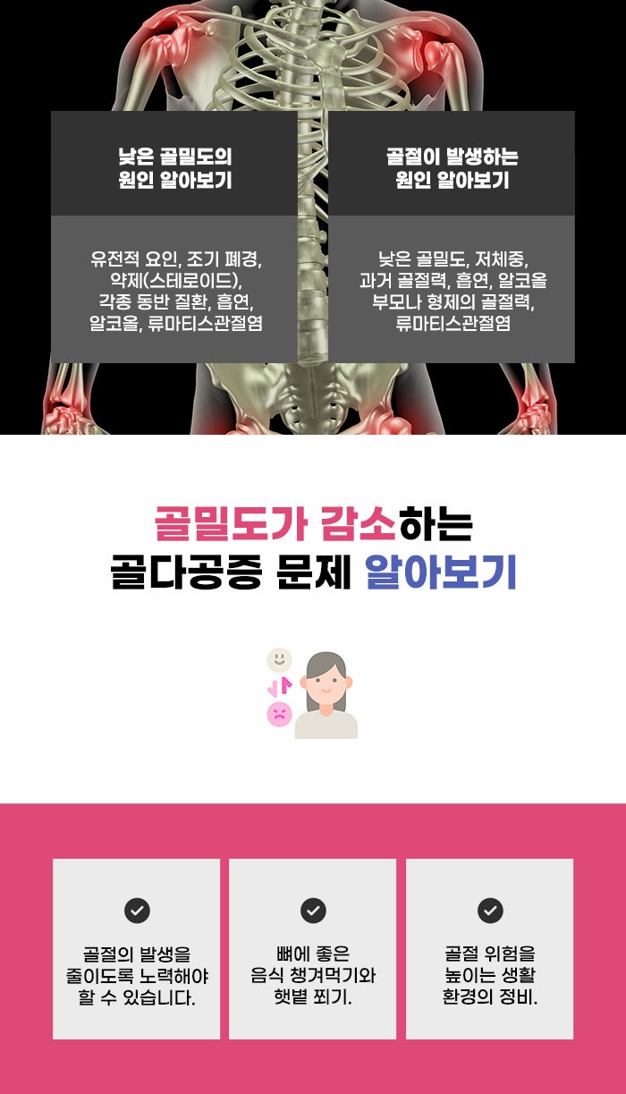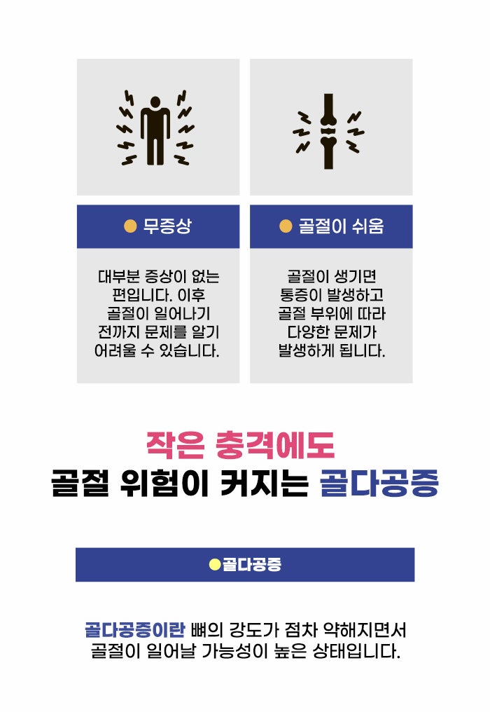 골절이 쉬운 상태가 되는 것인데요. 그렇기에 작은 충격에도 골절이 생기게 됩니다. 특히 출산, 수유를 한 여성의 경우 골다공증의 위험이 클 수 있다고 알려져 있습니다. 갱년기 이후 뼈 건강에 대해서 더 주의해야 하는데요. 골다공증은 특별한 자각 증상이 없다가 골절이 된 후에야 발견하기도 합니다. 그렇기에 평소 예방을 위해 노력하는 게 좋겠습니다.