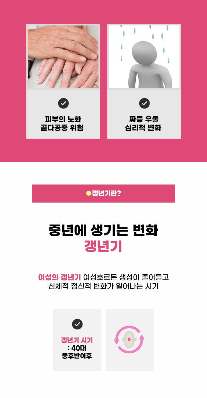 갱년기에는 급성 여성호르몬 결핍에 의해 여러 증상이 생길 수 있습니다. 갱년기 증후군은 갱년기에 겪는 다양한 문제를 통틀어 말합니다. 폐경이행기와 폐경 이후의 시기로 갱년기를 나눠볼 수 있는데요. 난소 호르몬 분비가 저하되는 시점에서부터 마지막 생리 후 1년까지의 기간을 폐경이행기라고 합니다. 그리고 무월경이 1년간 지속될 때 폐경이 된 것으로 본다고 합니다.