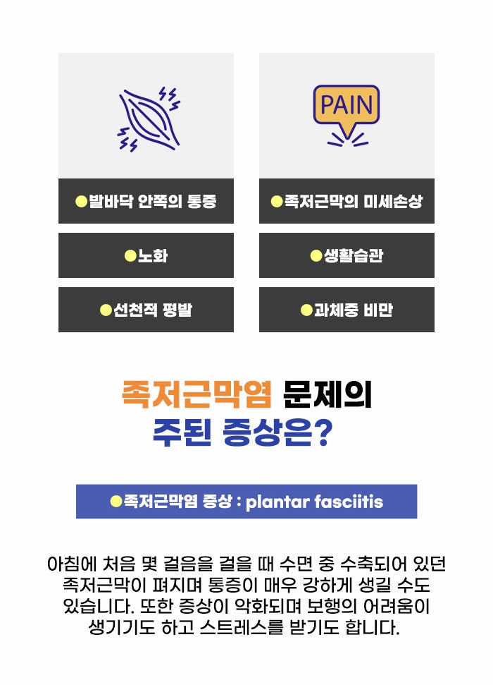 보행 시 발의 역학에 필요한 족저근막은 걷고, 뛰고, 서 있으면서 발에 가해지는 충격을 흡수하는 역할도 합니다. 이 중요한 족저근막은 반복적인 미세 손상으로 문제가 생길 수 있습니다. 근막을 구성하는 콜라겐의 변성이 유발되고, 염증이 진행되면서 통증을 느끼게 되는데요. 처음에는 통증이 별로 없고 활동할 때 통증을 느낀다고 합니다.