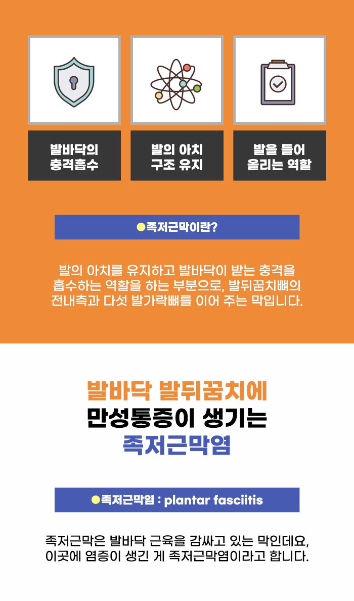 발바닥에 있는 막을 족저근막이라고 부릅니다. 이 부위에 염증이 생긴 상태를 두고 족저근막염이라고 합니다. 발가락 기저 부위로 다섯 개의 가지를 내어 붙어 있으며 발뒤꿈치 뼈에서 시작하는 두꺼운 막이 족저근막인데요. 발의 아치를 유지하는 두꺼우면서 강한 섬유띠라고 합니다. 또 이 족저근막은 체중이 실린 상태에서 발을 들어 올리는 데 중요한 도움을 준다고 합니다.