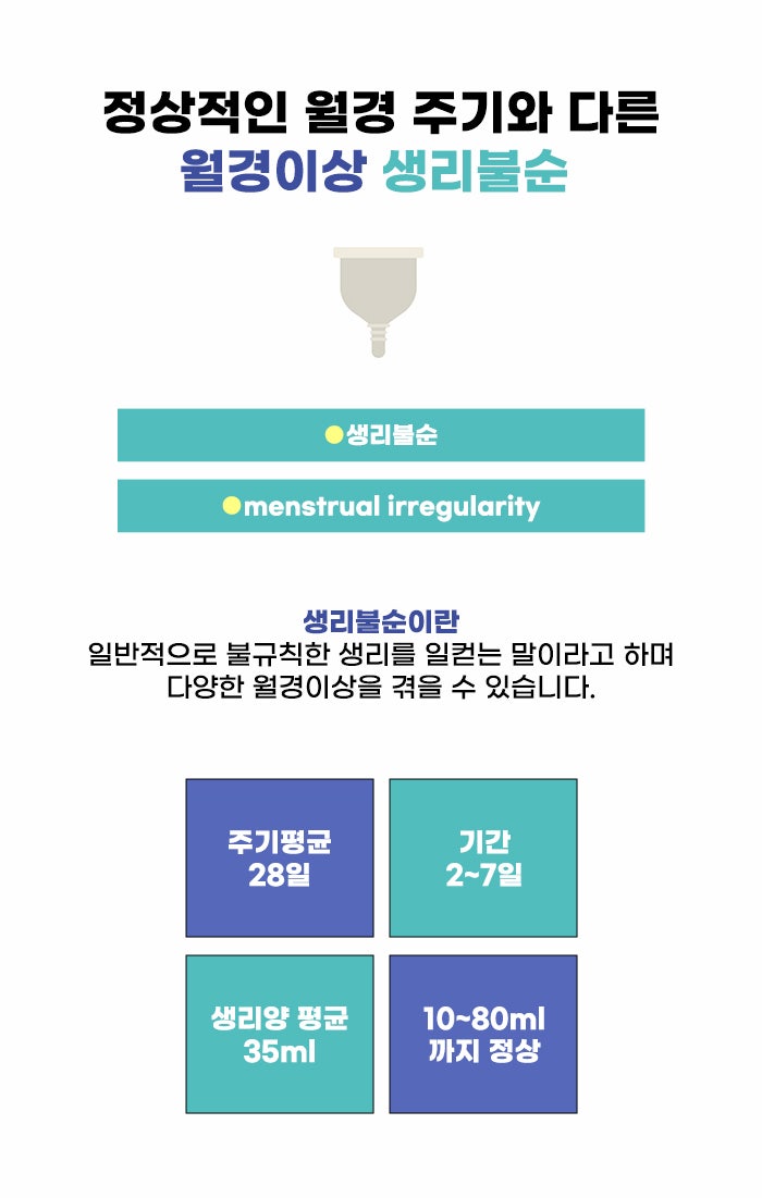 또한 생리양이 지나치게 적은 것도 생리불순 문제에 속할 수 있다고 하는데요. 또한 생리를 하지 않는 무월경 증상을 겪는 경우도 있다고 합니다. 정상적인 생리양은 보통 30ml 정도라고 하는데요. 일반적인 생리주기 평균은 28일 정도라고 합니다. 그리고 3-4일에서 일주일 정도 월경을 한다고 합니다. 평균적인 생리 양상과 다른 증상을 보인다면 내 건강을 살폈으면 좋겠습니다.